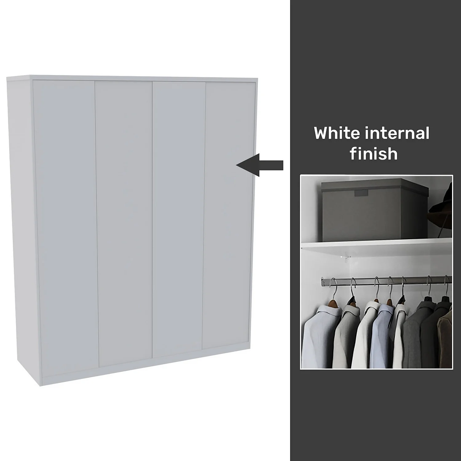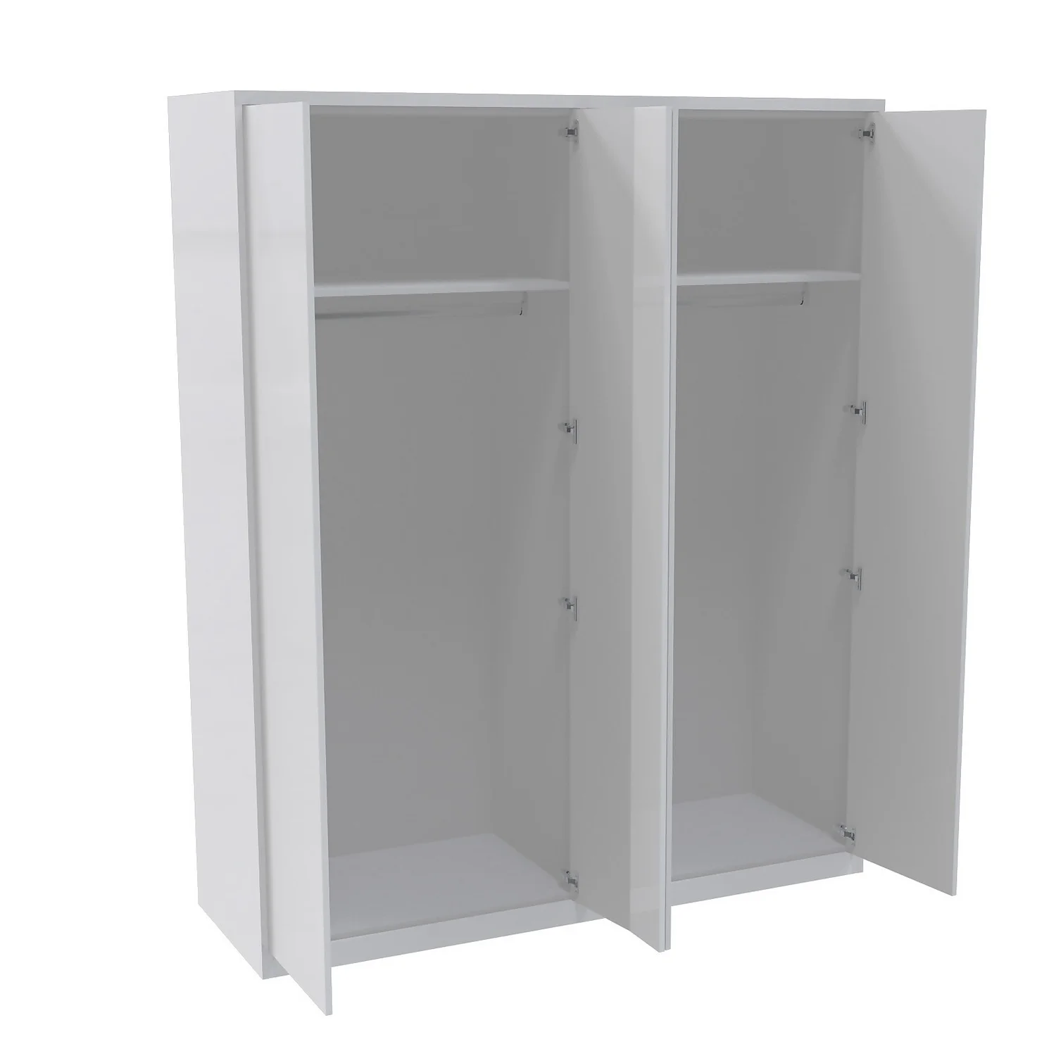 The House Beautiful range is exclusive to Homebase and offers a selection of different finishes and storage configurations to suit your needs. With a range of carcass colours and contrasting door designs, you can select the look to fit your bedroom aesthetic. The House Beautiful range now includes the fully fitted look with this combination pack which includes the wardrobe, end panels, plinth and cornice, meaning you can complete your bedroom with a luxury look. Coordinating chests of drawers are also available separately. This four door wardrobe (2 x double units) features a white internal carcass and includes end panels, plinth and matching cornice all in a finish to match the beautiful luxe gloss white slab doors. The wardrobe features premium soft close clip-on Blum hinges, two shelves and two hanging rails. You can customise your wardrobe with our additional internal storage options (available separately) including internal drawers, shelves, dividing shelves and extra hanging rails. Choose your handles from our range of both traditional and modern to suit your desired look.