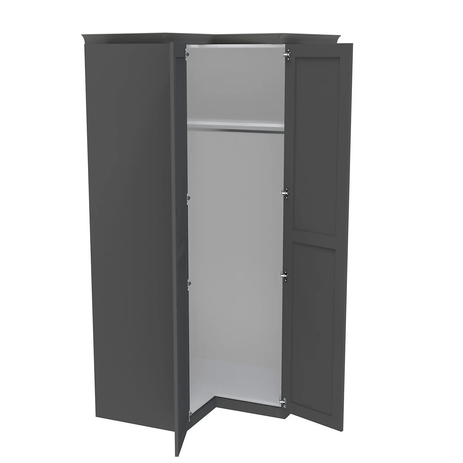 This corner wardrobe (1 x double unit and corner conversion) features a white internal carcass and includes end panels, plinth and matching cornice all in a finish to match the beautiful luxe matt carbon grey shaker doors. The wardrobe features premium soft close clip-on Blum hinges, five shelves and a hanging rail. You can customise your wardrobe with our additional internal storage options (available separately) including internal drawers, shelves, dividing shelves and extra hanging rails. Choose your handles from our range of both traditional and modern to suit your desired look.