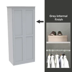 This double wardrobe features a grey internal carcass which includes end panels, plinth and matching cornice all in a finish to match the beautiful luxe matt white shaker doors. The wardrobe features premium soft close Blum hinges, a shelf and a hanging rail. You can customise your wardrobe with our additional internal storage options (available separately) including internal drawers, shelves, dividing shelves and extra hanging rails. Choose your handles from our range of both traditional and modern to suit your desired look.