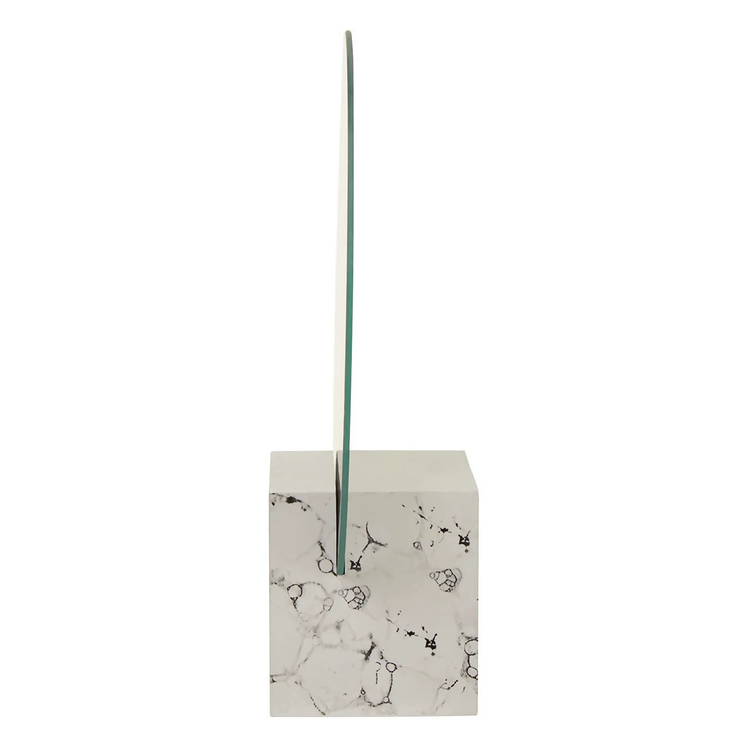 Formed into a round shape, this mirror sits on a square block that neatly holds it in place. The base has a muted white surface in circular black veining to form a faux marble pattern. Ideal to add more light, this contemporary mirror with minimal detailing and a soft accent will suit a Nordic setting.