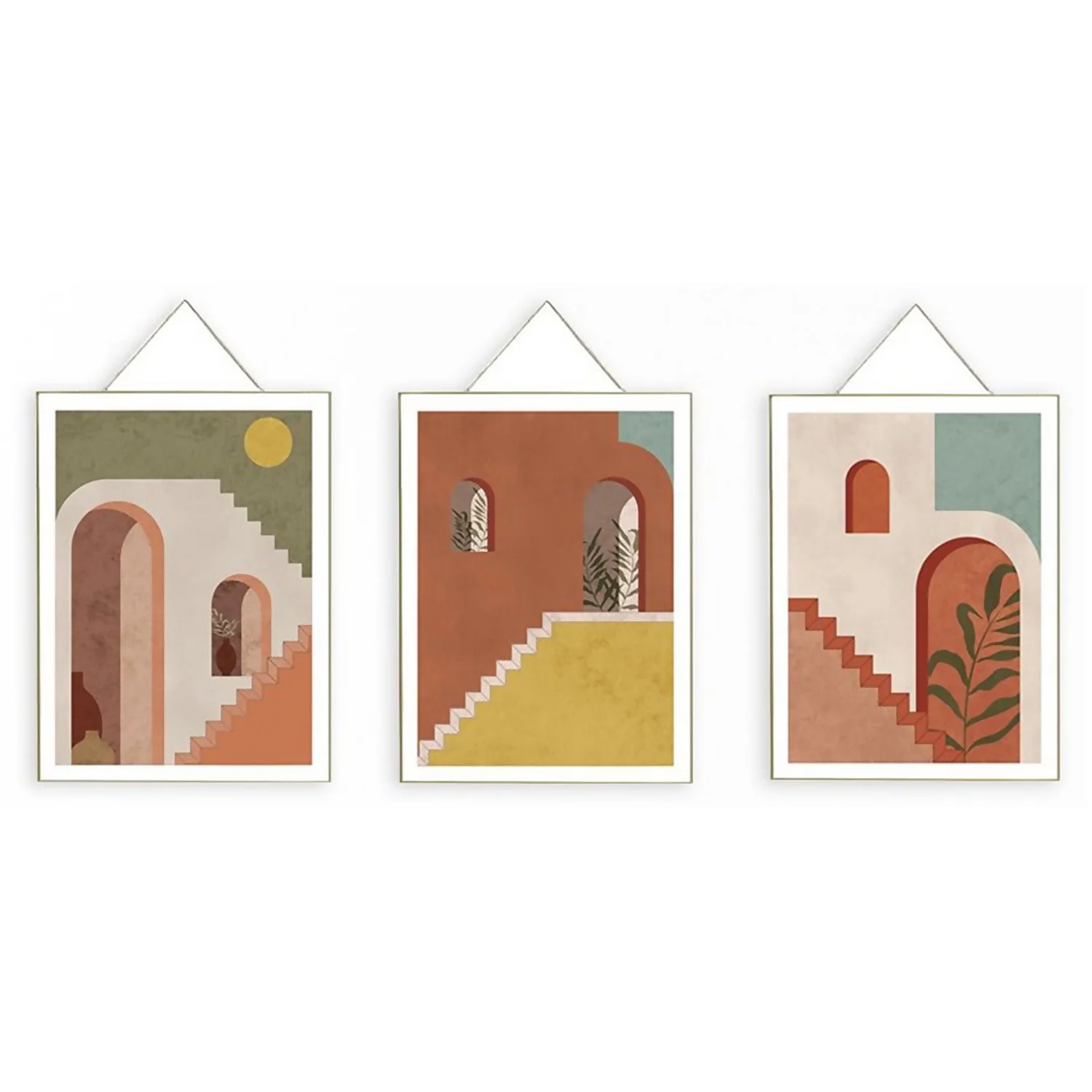 Graphic illustrations of classic Moroccan houses in a mix of colours which would add a striking look to your walls. These prints are great for adding an exotic and summery feel to your home! Finished with metal frames and silver chains for hanging. This is a set of three hanging frame prints measuring 30×40 cm each.