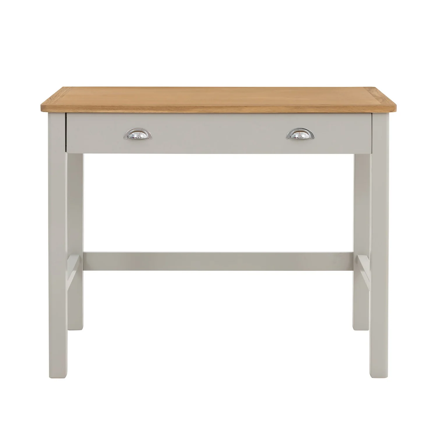 We’ve worked hard to make Norbury our most family-friendly range yet. We’ve softened all the edges, even the legs, so there are no sharp corners here. This compact collection has a small footprint. Meet our oak Norbury desk table. With its classic oak finish and cup handles, it has a charming timeless design. The top is deep enough to fit larger sized monitors and there is ample space for a keyboard or laptop. The wide drawer makes taking care of paperwork that bit easier. Whether this is your home office desk or a place to study, create a workspace youรขโฌโขre happy to spend time in with Norbury.
